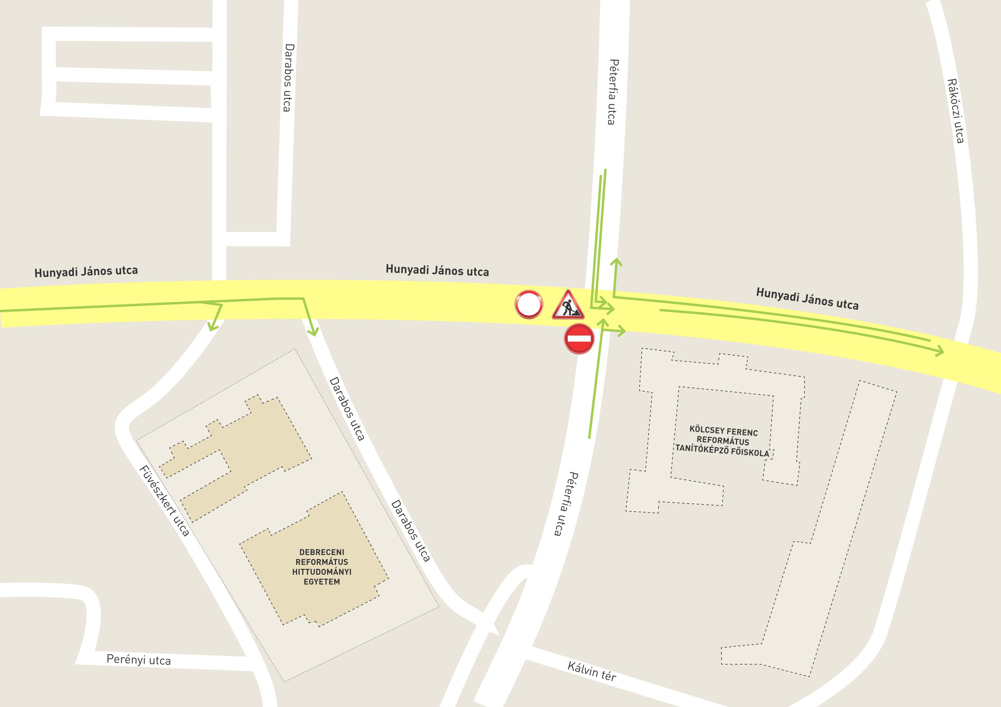 A kivitelező az érintett kereszteződésben villamospálya építést végez. A vágányok lefektetéséhez, a villamospálya ívének szakszerű műszaki beépítéséhez a Hunyadi János utca – Péterfia utca csomópont ideiglenes lezárása szükséges.