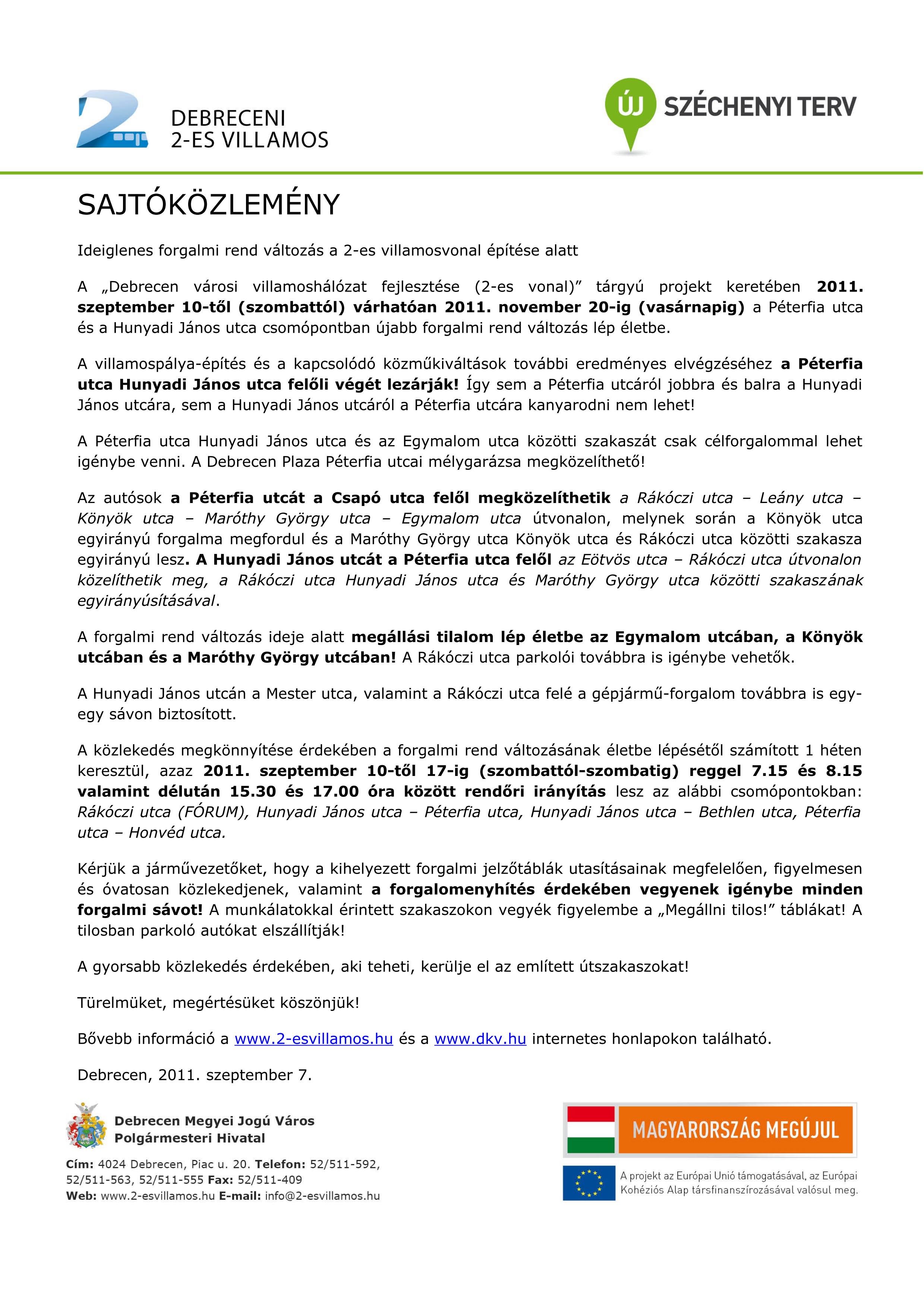 A „Debrecen városi villamoshálózat fejlesztése (2-es vonal)” tárgyú projekt keretében 2011. szeptember 10-től (szombattól) várhatóan 2011. november 20-ig (vasárnapig) a Péterfia utca és a Hunyadi János utca csomópontban újabb forgalmi rend változás lép életbe.