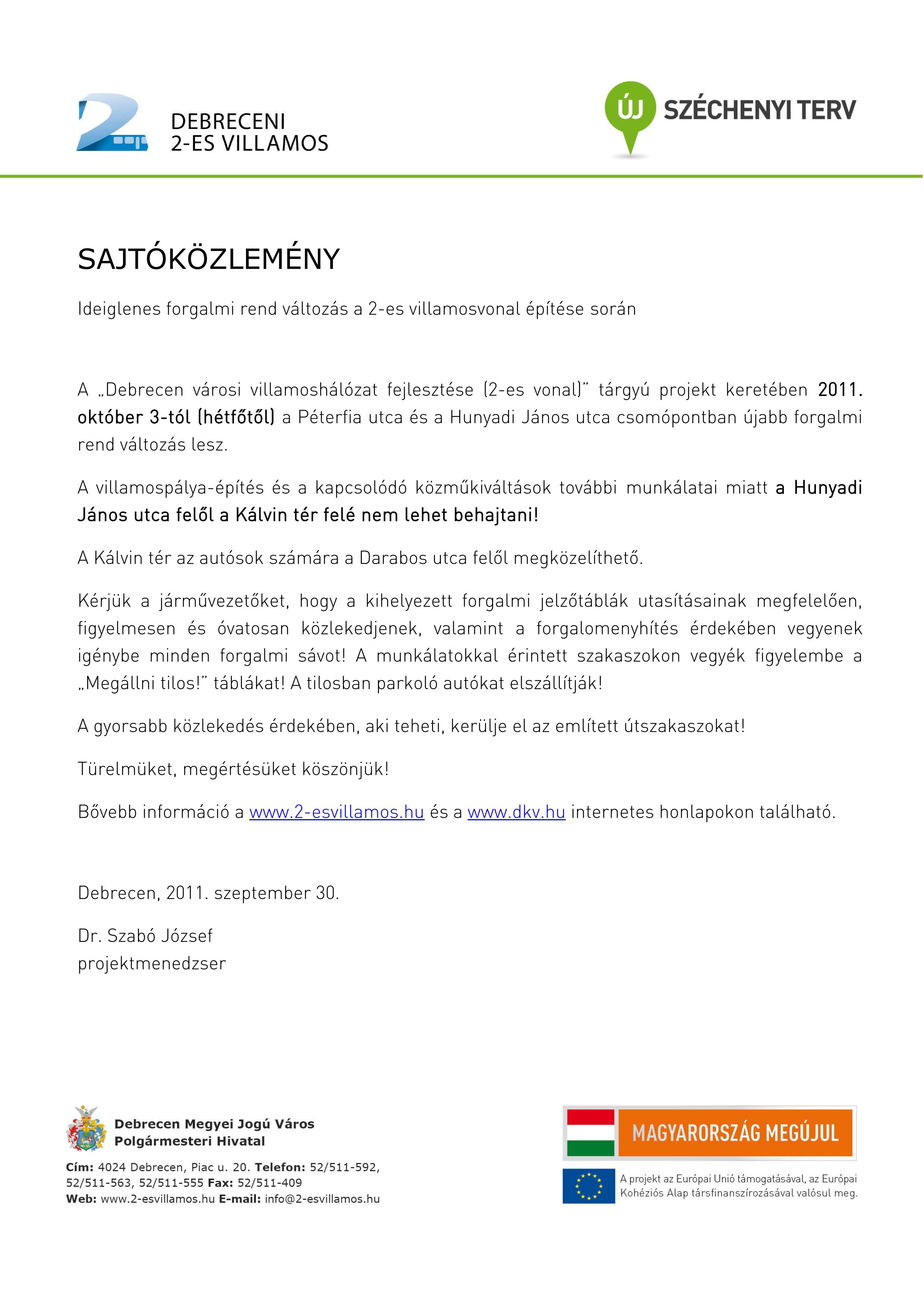 A „Debrecen városi villamoshálózat fejlesztése (2-es vonal)” tárgyú projekt keretében 2011. október 3-tól (hétfőtől) a Péterfia utca és a Hunyadi János utca csomópontban újabb forgalmi rend változás lesz.