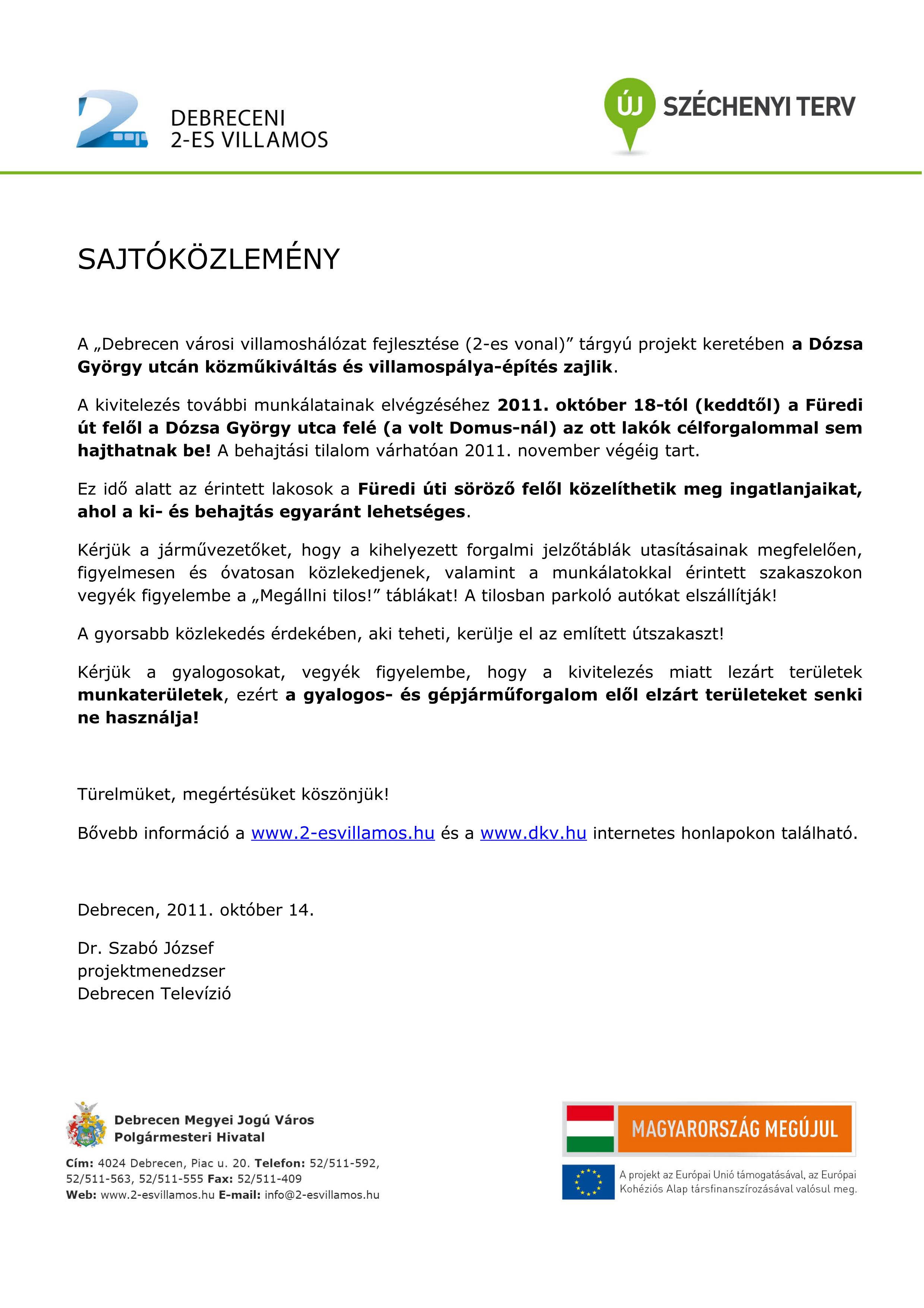 Ideiglenes forgalmi rend változás a Dózsa György utcán