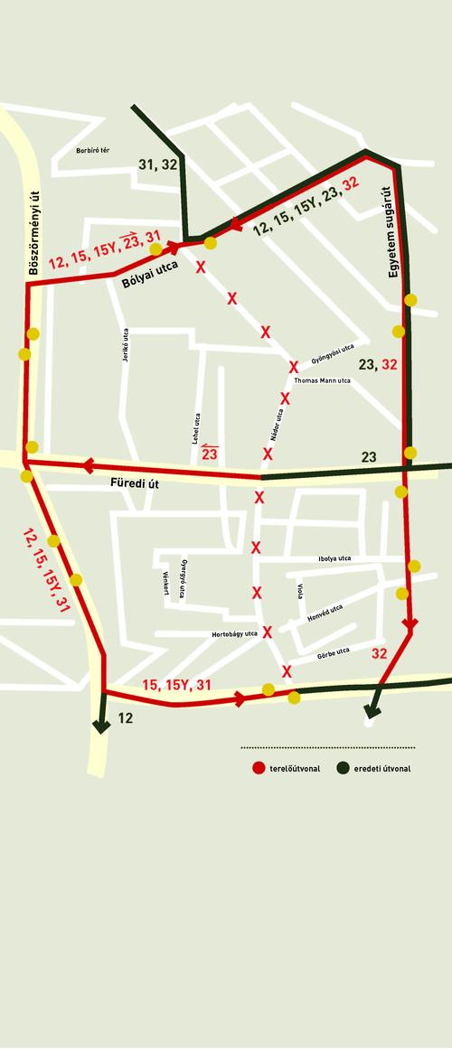 A forgalomkorlátozás a tömegközlekedést is érinti: az autóbuszok terelőútvonalon közlekednek 2013. április 2-től várhatóan június 30-ig. A 12-es, 15-ös, 15Y-os, 31-es és 23-as számú autóbuszok a Böszörményi út felé, a 32-es számú autóbuszok az Egyetem sugárút felé kerülnek. Az ideiglenes megállóhelyeket a térképvázlaton tekinthetik meg.